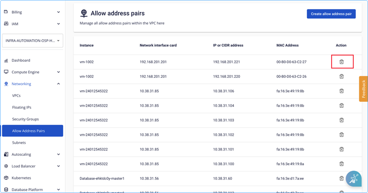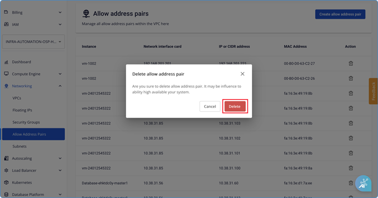 allow-address-pairCách 1: Xóa tại màn hình quản lý Allow address pairDelete Address Pair Cách 1: Xóa tại màn hình quản lý Allow address pair Bước 1 : Chọn icon delete Bước 2 : Xác nhận delete Cách 2: Xóa trong Instance Management Bước 1 : Vào Network Interface trong Instance Management. Bước 2 : Bấm vào icon X Bước 3 : Xác nhận Delete
