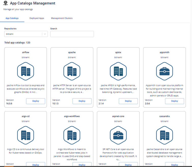 Với một App Catalogs Management, bạn sẽ được cung cấp thông tin chi tiết App Catalog tương ứng với từng repository, thực hiện quản lý các k8s cluster để deploy applications.