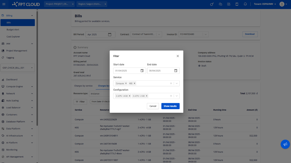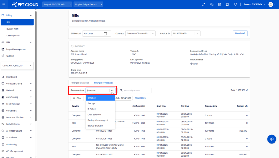 Người dùng có thể chọn loại tài nguyên (resource type) và xem chi tiết số lượng sử dụng - đơn giá - thành tiền với từng tài nguyên. Dữ liệu Charges by resource sẽ tương ứng với dữ liệu tại sheet “Details” trong file đối soát khi người dùng tải về. file file