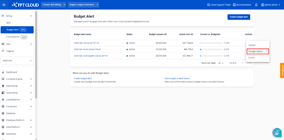 Bước 1: Tại menu, chọn Billing > Chọn Budget Alert. Hệ thống hiển thị danh sách Budget Alert list đã tạo > Chọn Actions tại Bugdet Alert cần dừng cảnh báo