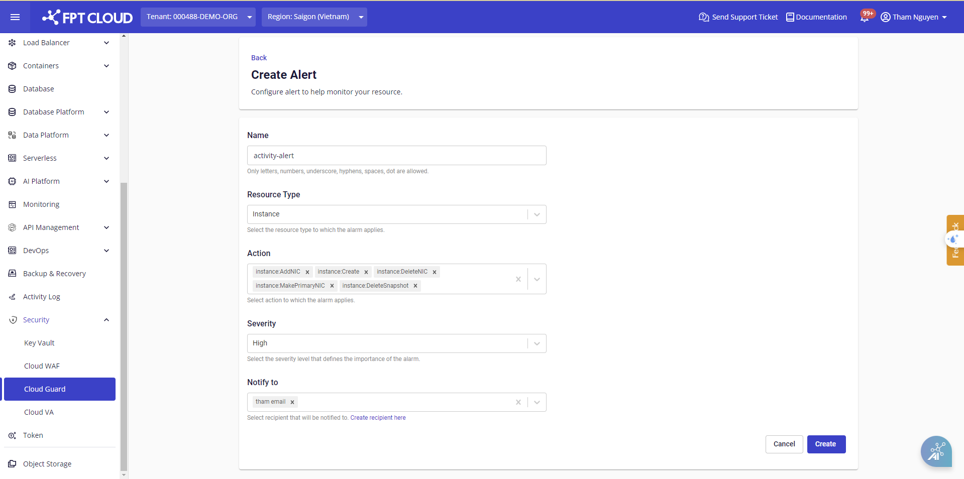 Bước 1 : Ở menu chọn Security > Cloud Guard , mở tab Activity Alerts và chọn Create Alert. file Một hộp thoại mới sẽ hiện lên và hướng dẫn người dùng thực hiện các bước tiếp theo. Bước 2 : Cấu hình cảnh báo theo nhu cầu bằng cách nhập thông tin vào trường dữ liệu tương ứng: