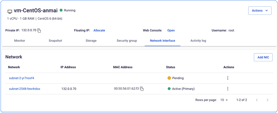 Unify Portal hỗ trợ tính năng thêm mới card NIC dễ dàng và linh hoạt, tùy thuộc vào nhu cầu của khách hàng. Thao tác thêm mới được thực hiện một cách đơn giản và tiện lợi. Bước 1 : Chọn Add NIC. file Bước 2 : Chọn Subnet theo nhu cầu. file file file Bước 3: Chờ hệ thống xử lý. Tại đây, hệ thống sẽ cấp ngẫu nhiên một địa chỉ IP trong Subnet trên. file Bước 4: Card chuyển sang trạng thái Active, và Instance có thể kết nối mạng qua card này. file