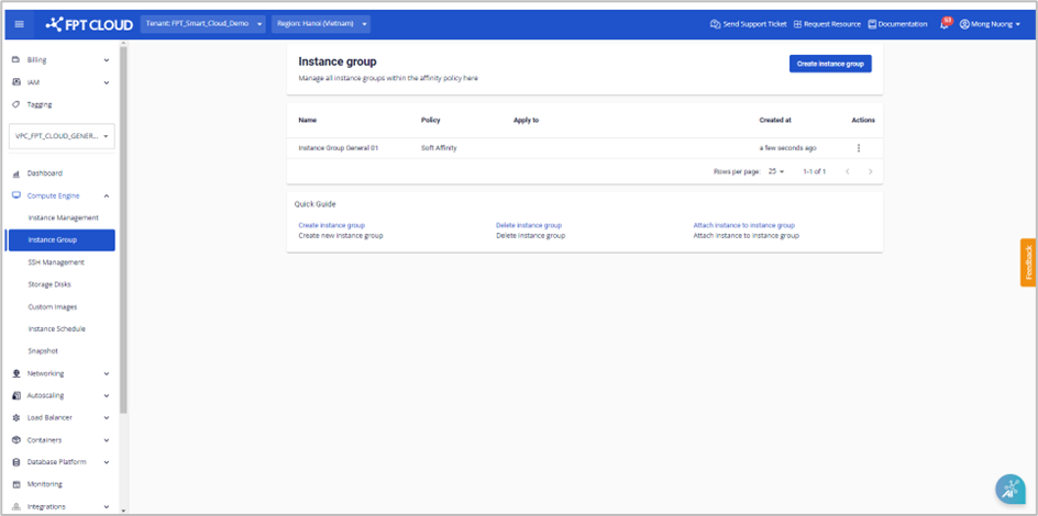 Nếu thành công, instance group mới sẽ được hiển thị ở trang Instance Group.