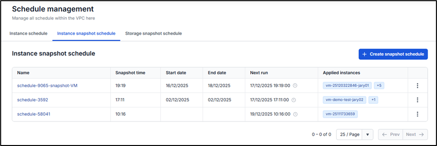 file Bước 3: Chọn Create Schedule. Hệ thống sẽ tiền hành khởi tạo và thông báo kết quả. Nếu thành công, lịch mới sẽ được hiển thị ở trang Instance snapshot schedule file