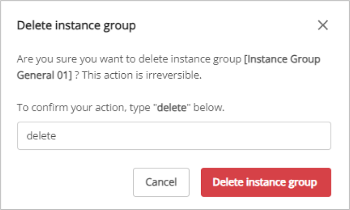 Tính năng áp dụng cho người dùng sử dụng dịch vụ General và Specific. Lưu ý: Thao tác này sẽ đồng thời gỡ instance group khỏi các instances đã gắn với nó. Việc xóa instance group này sẽ không thể khôi phục lại được. Bước 1 : Ở menu chọn Instance Group , trong phần Actions , chọn Delete file Bước 2 : Một hộp thoại cảnh báo sẽ hiện lên, hiển thị tên Instance Group và yêu cầu người dùng xác nhận. Người dùng nhập delete và chọn Delete instance group để xác nhận xóa. Hệ thống sẽ tiến hành gỡ các máy ảo gắn với instance group. Sau đó hệ thống sẽ xóa hoàn toàn Instance group. file