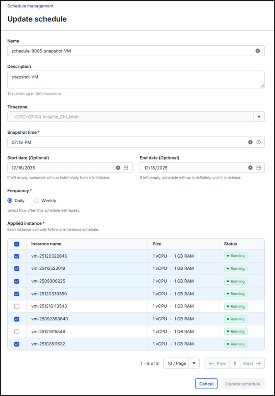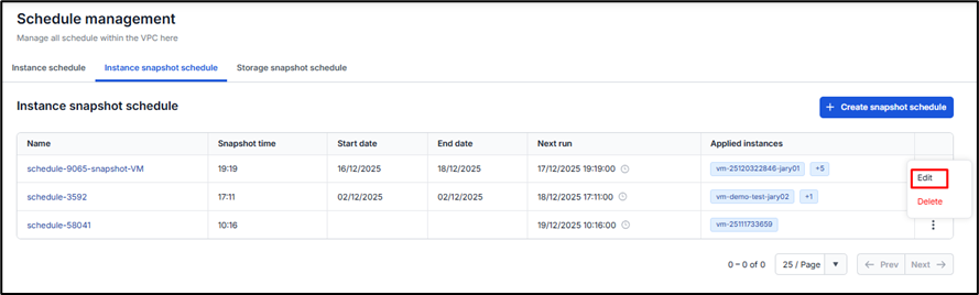 Bước 1: Trên tab Instance snapshot schedule, chọn tên của lịch phần action, chọn Edit file Bước 2: Chỉnh sửa các thông tin của lịch theo nhu cầu file Bước 3: Bấm Update schedule, nếu thành công, lịch mới sẽ được cập nhật trên hệ thống.