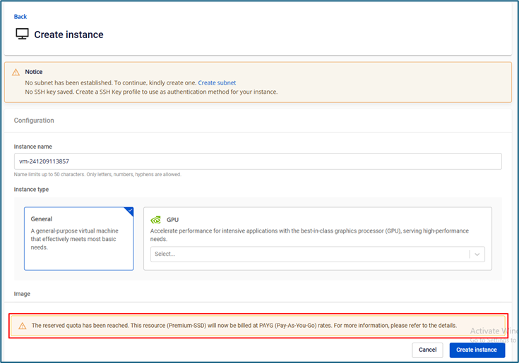 Trong quá trình tạo tài nguyên mới, nếu dịch vụ đang tạo đã hết thì người dùng sẽ nhận được thông báo loại tài nguyên nào đã hết và sẽ được chuyển đổi hình thức thanh toán. Các dịch vụ đã hỗ trợ phương thức tính tiền PAYG