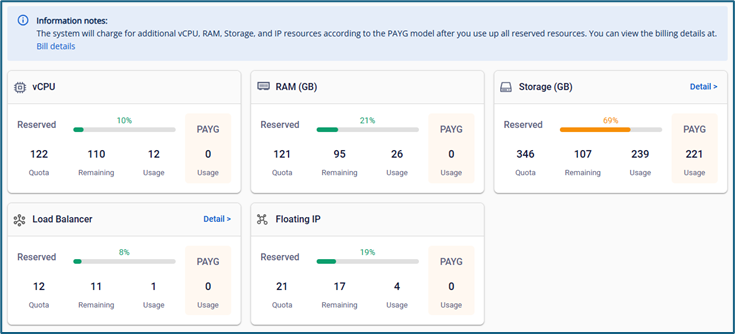 Note: Số lượng tài nguyên tính theo PAYG không cố định. Khi người dùng xóa bớt tài nguyên về dưới số lượng đã trả trước, hệ thống tự động cập nhật số liệu và ngưng tính tiền tài nguyên PAYG.