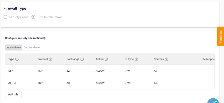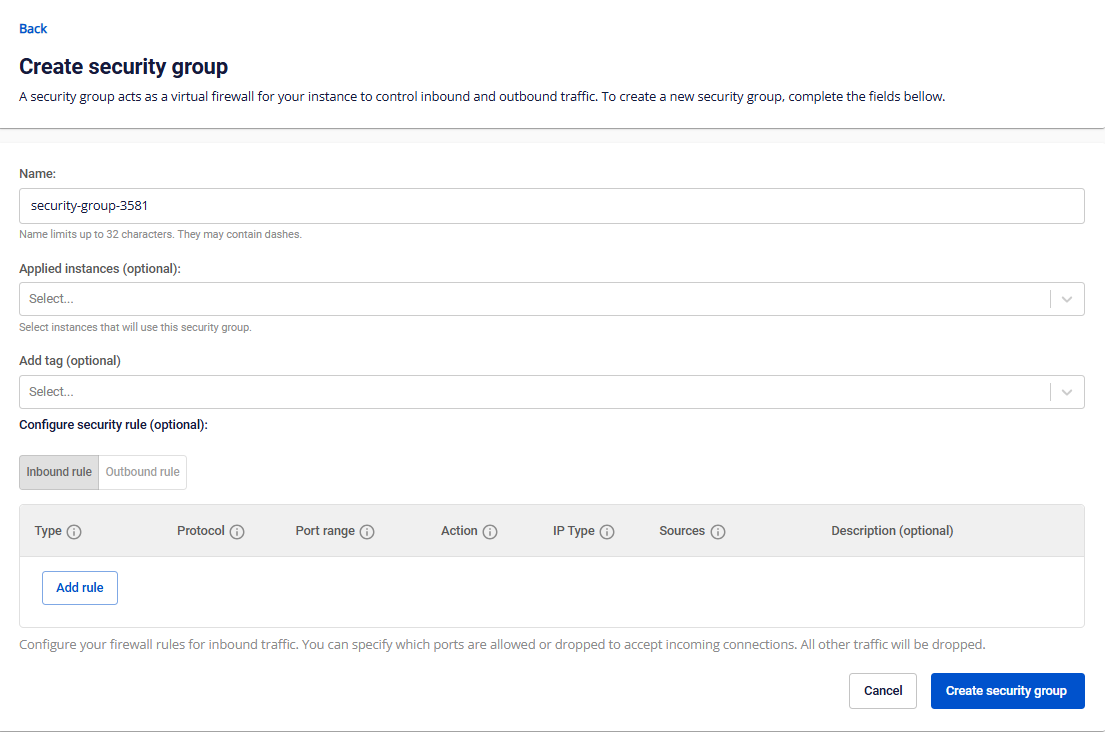 Inbound rules là các rule giúp quy định cổng (Port) nào sẽ được mở trên máy ảo và địa chỉ nào trên Internet sẽ được truy cập vào cổng đấy (Source). Outbound rules là các rule giúp quy định cổng (Port) nào sẽ được mở trên máy ảo và địa chỉ nào trên Internet sẽ được truy cập ra từ cổng đấy (Destination). Một Security Group có thể chứa nhiều Inbound rulesOutbound rules khác nhau. Để thêm rule, mở port cho Security Group bạn thao tác như sau: Bước 1 : Trên bảng quản trị Security group , chọn Security group cần quản lý rule để vào trang Security group detail. Lưu ý: Không thể điều chỉnh Firewall type sau khi đã khởi tạo Bước 2 : Chọn Add New trong phần Inbound rules (tương tự với outbound rule). file Bước 3 : Điền các thông tin cần thiết của Rule: