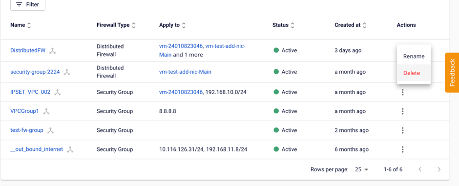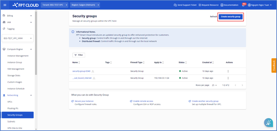 Việc sử dụng các loại tường lửa này đảm bảo an toàn cho máy ảo bằng cách ngăn chặn các cuộc tấn công như DDoS và các mối đe dọa khác từ internet hoặc virus. Để quản lý các Security group , bạn vào trangSecurity Groups ở nhóm Service Networking Ở đây bạn có thể tạo mới, xem danh sách, sửa thông tin, xóa các Security group trong VPC.