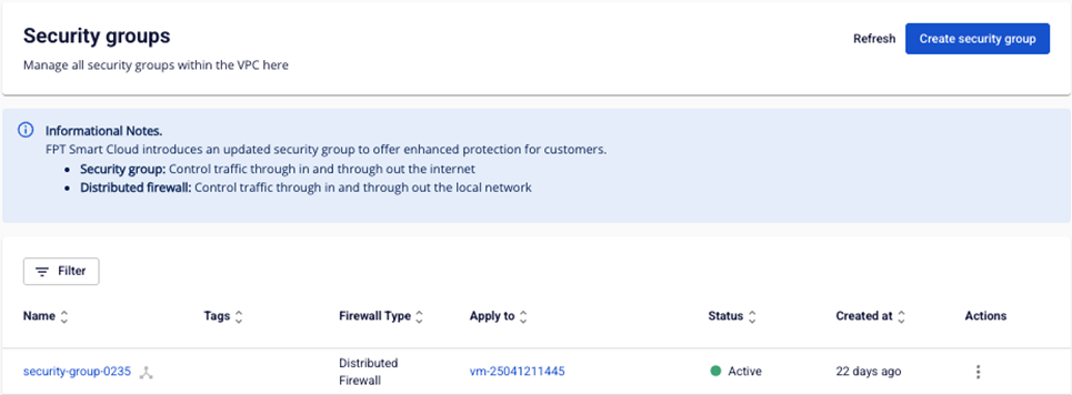 Security Group hoạt động như một tường lửa mạng ảo, cho phép các kết nối đi vào (inbound) và ra khỏi (outbound) máy ảo. Trong FPT Cloud, có hai loại tường lửa: