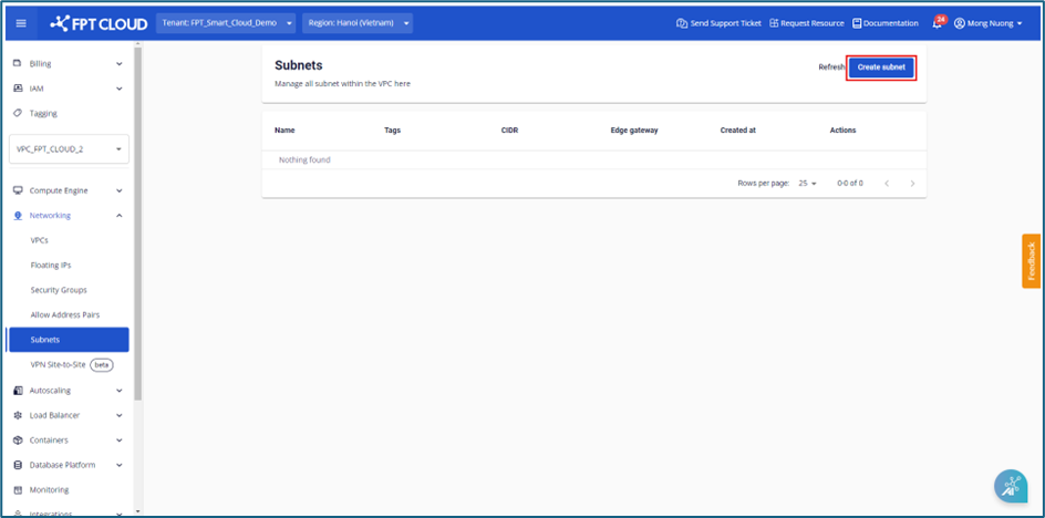 Bước 1 : Ở menu chọn Subnet , hệ thống sẽ hiển thị ra danh sách Subnet tương ứng