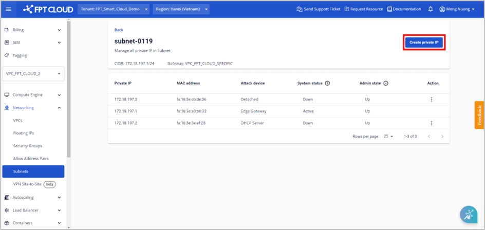 Bước 4 : Người dùng nhấn Create Private IP để tạo địa chỉ IP. Hệ thống sẽ tiến hành khởi tạo và thông báo kết quả. Địa chỉ private IP sau khi được khởi tạo sẽ được hiển thị ở trang chi tiết Subnet