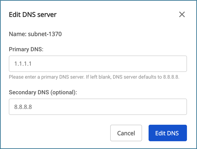 - Secondary DNS (optional) : Nhập Secondary DNS theo định dang địa chỉ IPv4. Nếu không nhập, hệ thống sẽ tự động tạo giá trị mặc định là 8.8.8.8.