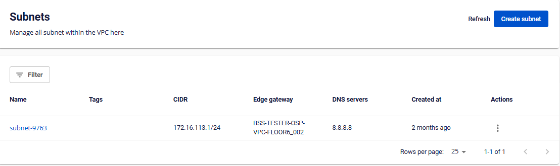 Hệ thống cập nhật thông tin trên màn hình danh sách subnet với Type và Edge gateway