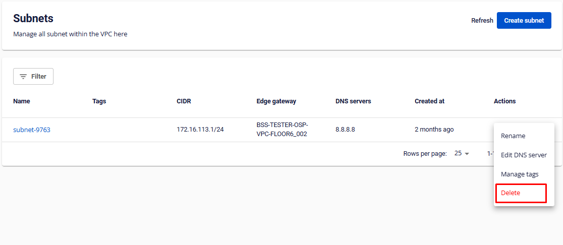 Bước 1 : Ở menu chọn Subnets , trong phần Actions của subnet cần đổi tên > Chọn Delete.