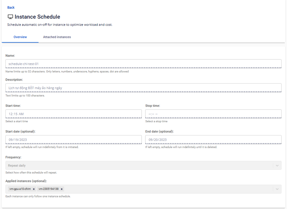 Bước 2 : Xem & kiểm tra thông tin chi tiết cua instance schedule trong mục Overview bao gồm: Name, description, start& stop time, start & end date, frequency, tên các máy ảo gắn kèm
