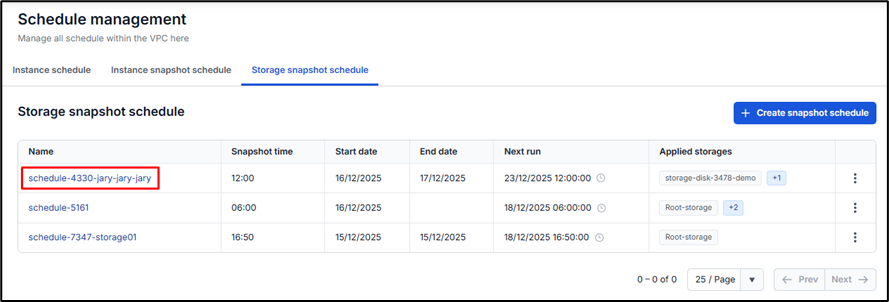 Bước 1: Trên tab Storage snapshot schedule, chọn tên của lịch cần xem.