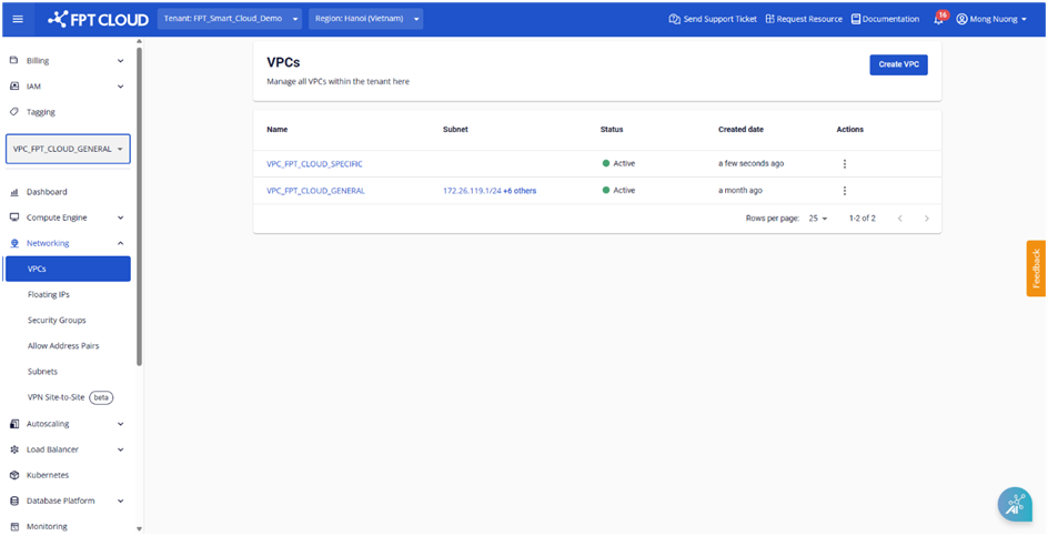 Để khởi tạo một VPC mới, người dùng cần đăng nhập vào hệ thống với phân quyền Tenant Owner Bước 1 : Ở menu chọn VPCs , chọn Create VPC file Bước 2 : Nhập các thông tin sau: