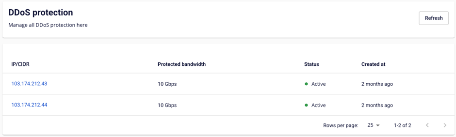 Người dùng có thể monitor hệ thống và sự bảo vệ thông qua dashboard do FPT Cloud Portal cung cấp. Bước 1 : Người dùng vào màn hình danh sách IP đang được bảo vệ và chọn IP cần kiểm tra file Bước 2a : Với IP đang được bảo vệ và không có bị tấn công trong tháng, hệ thống sẽ hiện thị màn hình thông báo IP đang được bảo vệ an toàn và chưa ghi nhận sự tấn công. file Bước 2b : Với trường hợp có ghi nhận đợt tấn công. Hệ thống sẽ thông tin các đợt tấn công gồm: Thông tin nhanh sự bảo vệ trong tháng: