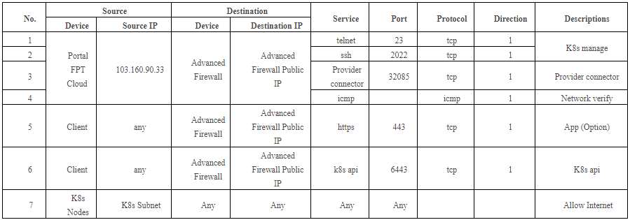 Luồng traffic truy cập vào các node k8s như sau: file Chú ý: Tất cả các rule inbound và outbound cho cụm Kubenetes đều được cấu hình trên Advanced Firewall. Tất cả các rule NAT cho cụm Kubenetes đều được cấu hình trên Advanced Firewall. IP Public được đặt trên Advanced Firewall. Bảng quy hoạch rule Firewall trên Advanced Firewall cho cụm Kubenetes: file Bảng quy hoạch rule NAT trên Advanced Firewall cho cụm Kubenetes: file Trên Gateway vẫn có rule Firewall và rule Nat ở để đảm bảo traffic kết nối từ Gateway đến Firewall, các rule mặc định này được tạo tự động, người dùng phải tạo rule cho ứng dụng (option) nếu cần.