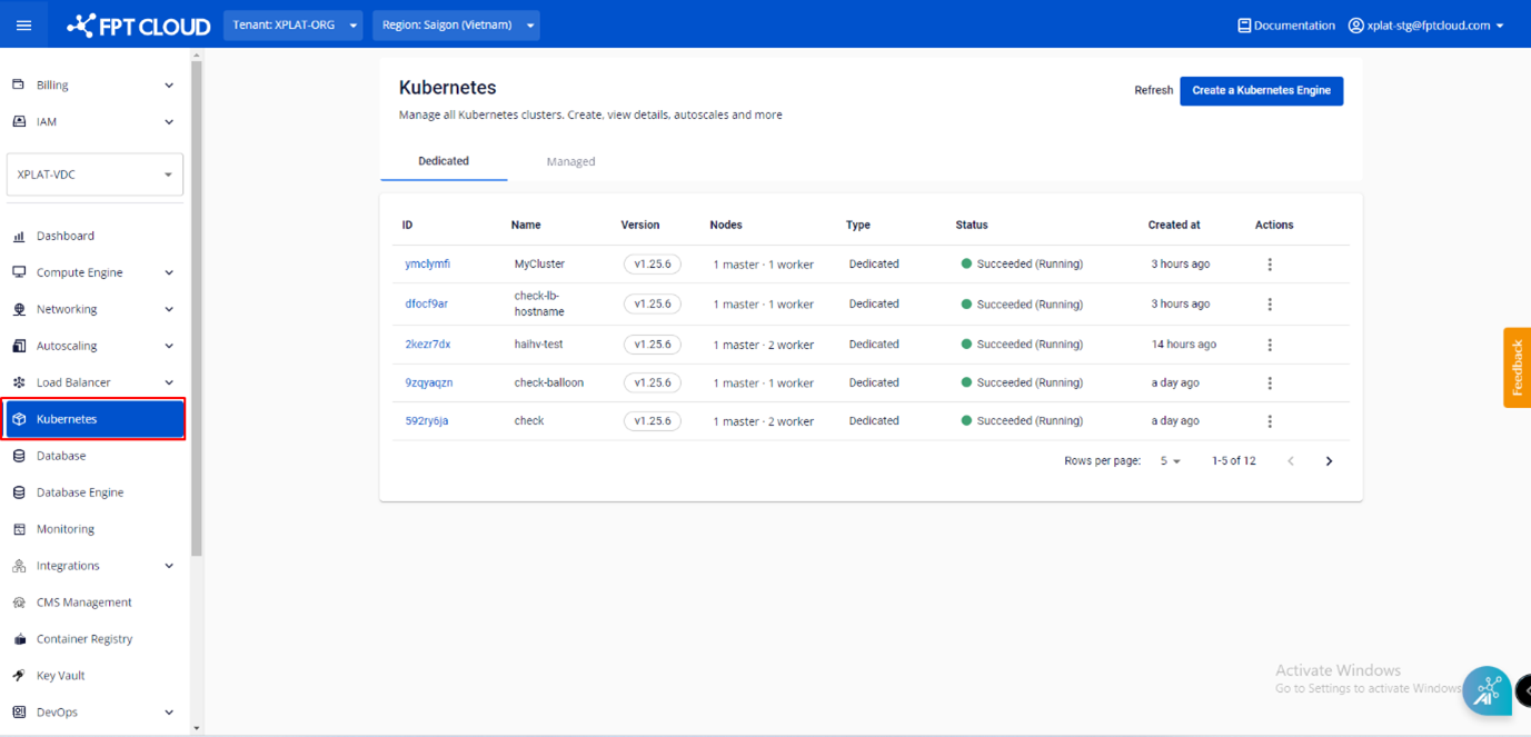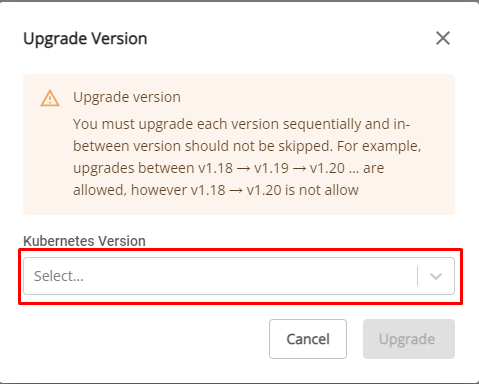 Bước 1 : Ở menu chọn Kubernetes , hệ thống sẽ hiển thị trang Kubernetes Management. Bước 2 : Chọn Cluster muốn thay đổi cấu hình nodes trên danh sách. Bước 3 : Chọn tab Essential Properties , tại mục Cluster Information > Version. Chọn icon Setting. Bước 4: Chọn Version cần nâng cấp và chọn Upgrade. Lưu ý: Chỉ có thể nâng cấp version, không thực hiện được việc hạ version.