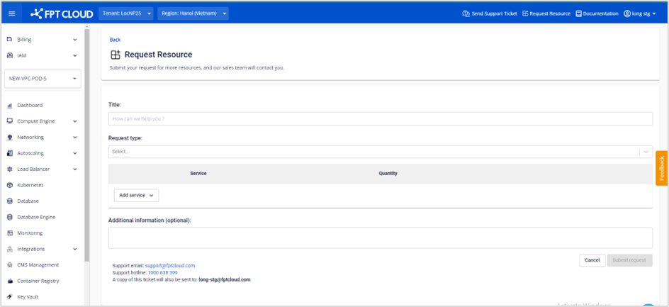 • Các trường thông tin bắt buộc bao gồm: Title, Request type, Service, Quantity