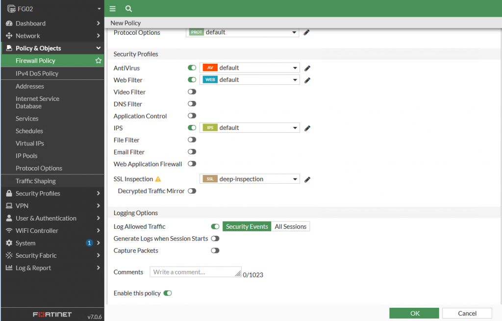 • SSL Inspection: Chuyển sang dạng deep-inspection. Yêu cầu cài đặt certificate trên browser người dùng. (Có thể download certificate bằng cách click vào Deep-inspection > Edit > Download certificate)
