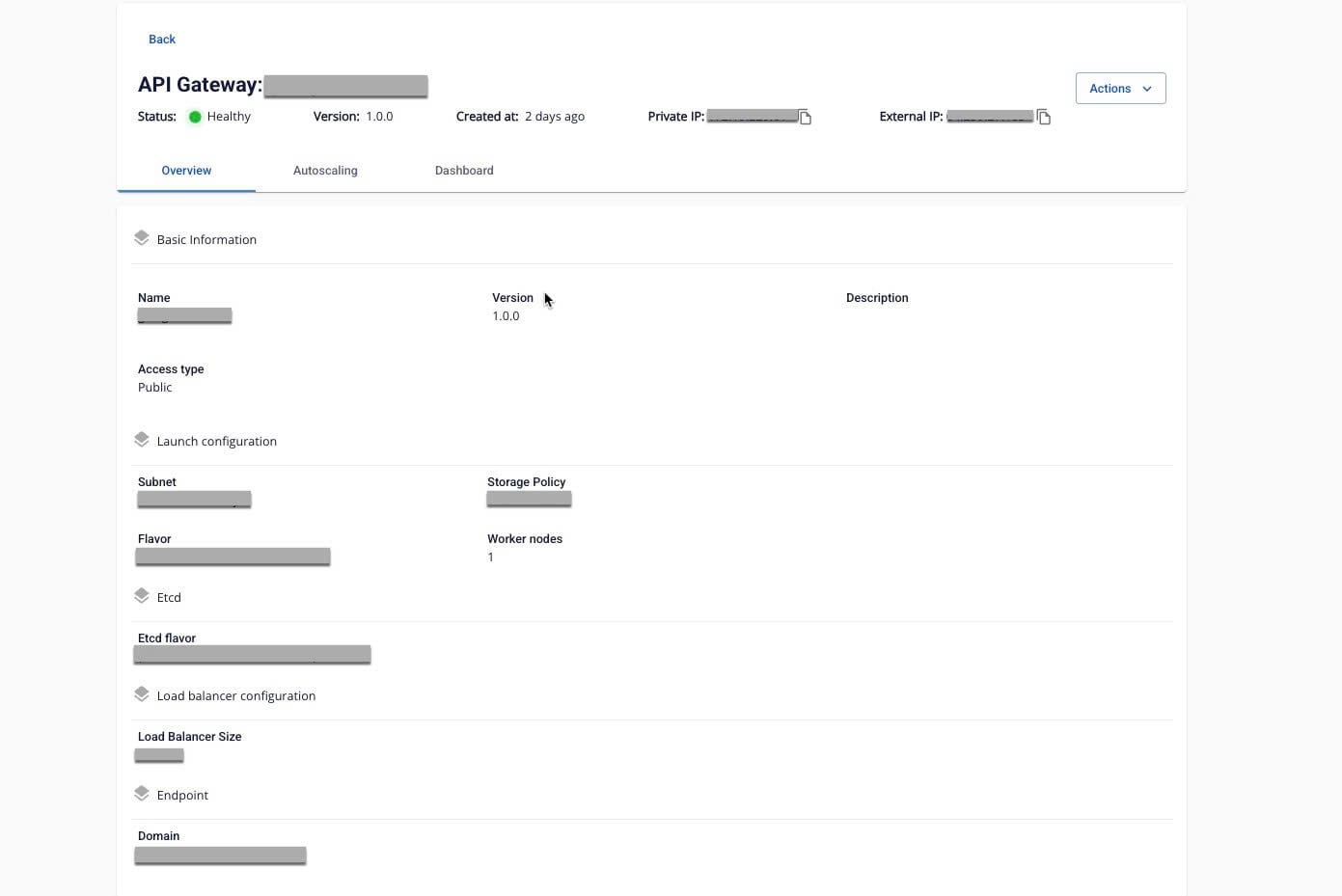 Hiển thị thông tin cơ bản của API Gateway: Basic information , Launch Configuration , Etcd , LB size , Endpoint Hỉnh ảnh