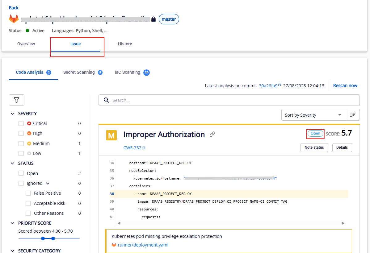 Bước 1. Tại màn hình asset list, chọn 1 asset bất kỳ và vào tab Issue. Trạng thái của issue sẽ được hiển thị tại từng issue card: anhfsec Người dùng có thể thực hiện filter issue theo status: Open , Ignored và các lí do issue bị ignored: anhfsec Bước 2. Để thay đổi trạng thái của issue, chọn “Note status” anhfsec Bước 3. Chọn trạng thái cần chuyển sang (hiện tại hỗ trợ 2 trạng thái: Open & Ignore): Đối với luồng chuyển từ Ignored sang Open, người dùng có thể thêm comment (không bắt buộc) rồi ấn “Save”. anhfsec Đối với luồng chuyển từ Open sang Ignored, người dùng cần chọn lí do ignore và có thể comment rồi ấn “Save” anhfsec Lưu ý: Trạng thái của issue sẽ được thay đổi vào lần scan tiếp theo