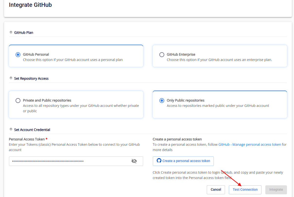 Lúc này hệ thống sẽ kiểm tra các miền bắt buộc và valid Personal Access Token , nếu một trong hai failed, màn hình sẽ hiển thị thông báo Test connection Failed(invalid PAT)