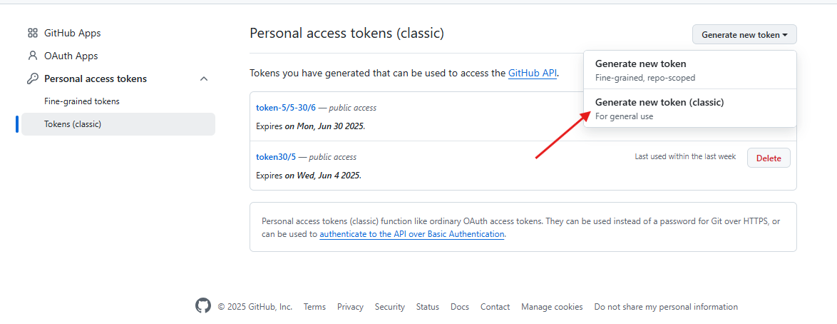 Bước 3 : Chọn Tokens (classic) ở thanh Menu bên trái và chọn Generate new token (Classic)