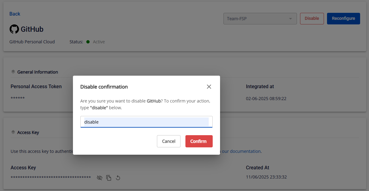Bước 1 : Nhấn Disable trong màn hình chi tiết của tích hợp GitHub
