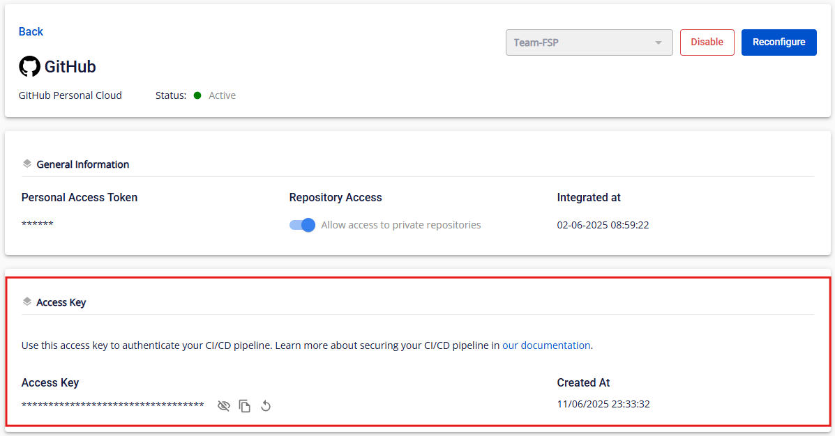 Ở đây, bạn có thể thấy các thông tin như Personal Access Token , Repository Access , Integrated at , và Access Key phục vụ cho tích hợp CICD