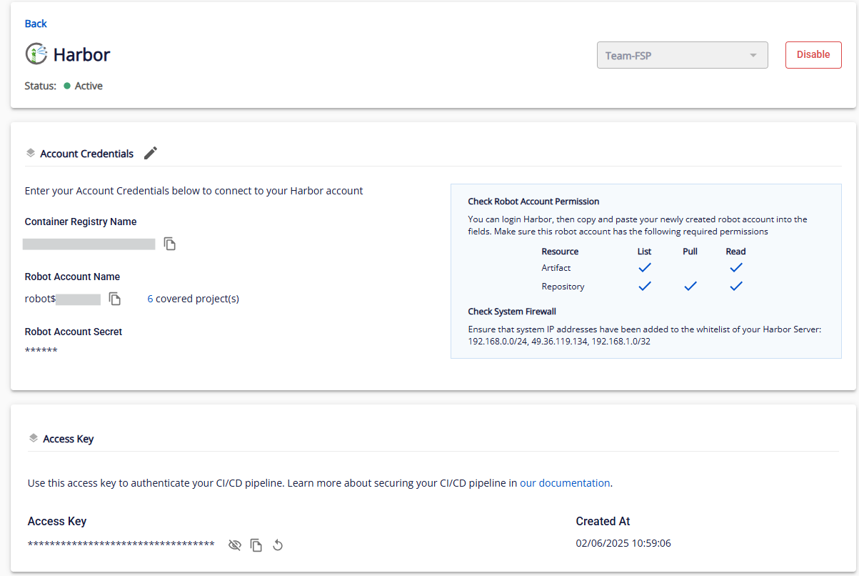 Chỉ Org AdminTeam Manager có quyền xem chi tiết tích hợp Sau khi đã chọn org/team, nhấn vào Configured Harbor để xem chi tiết anhfsec Ở đây, bạn có thể xem trạng thái của tích hợp, danh sách Integrated VPCs với các thông tin VPC, Robot Account Name, Container Registry NameAccess Key phục vụ cho tích hợp CICD. anhfsec Bạn có thể tiến hành Reintegrate hoặc Disable tích hợp Harbor anhfsec