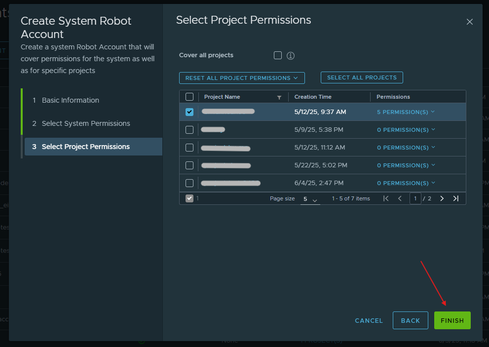 Bước 1 : Truy cập Harbor Server của bạn, chọn tab Administration > Robot Accounts Bước 2 : Nhấn New Robot Account để tạo mới anhfsec Bước 3 : Điền các thông tin như Name , DescriptionExpiration time sau đón nhấn anhfsec Bước 4 : Chọn các quyền hệ thống cần thiết sau đó nhấn anhfsec Bước 5 : Chọn các Project mà Robot Account cần có quyền sau đó chọn Permission cho Robot Account đó. Cần đảm bảo Robot Account có quyền List, Read Artifacts và quyền List, Pull, Read Repository anhfsec anhfsec Bước 6 : Sau khi điền hết thông tin, nhấn Finish anhfsec Bước 7 : Sau khi Robot Account được tạo thành công, copy Robot Account namesecret dùng cho tích hợp tại màn hình của FPT Portal anhfsec