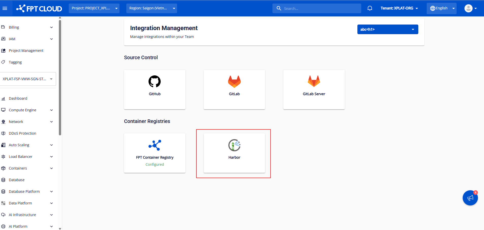Chỉ Org AdminTeam Manager có quyền chỉnh sửa tích hợp Harbor Xem thêm về phân quyềntại đây Bước 1 : Sau khi đã chọn org/team, nhấn vào Harbor để đến màn tích hợp: anhfsec Bước 2 : Điền Container Registry Name (URL Harbor server) của bạn, Robot Account NameRobot Account Secret (đã tạo từ Harbor) Alt text Bước 3 : Sau khi điền hết thông tin, nhấn Test Connection. Hệ thống sẽ kiểm tra thông tin các trường bắt buộc, nếu thông tin hợp lệ, hệ thống thông báo Connected successfully và nút Integrate được enabled Alt text Bước 4 : Sau khi hệ thống thông báo test kết nốt thành công, nhấn Integrate Alt text