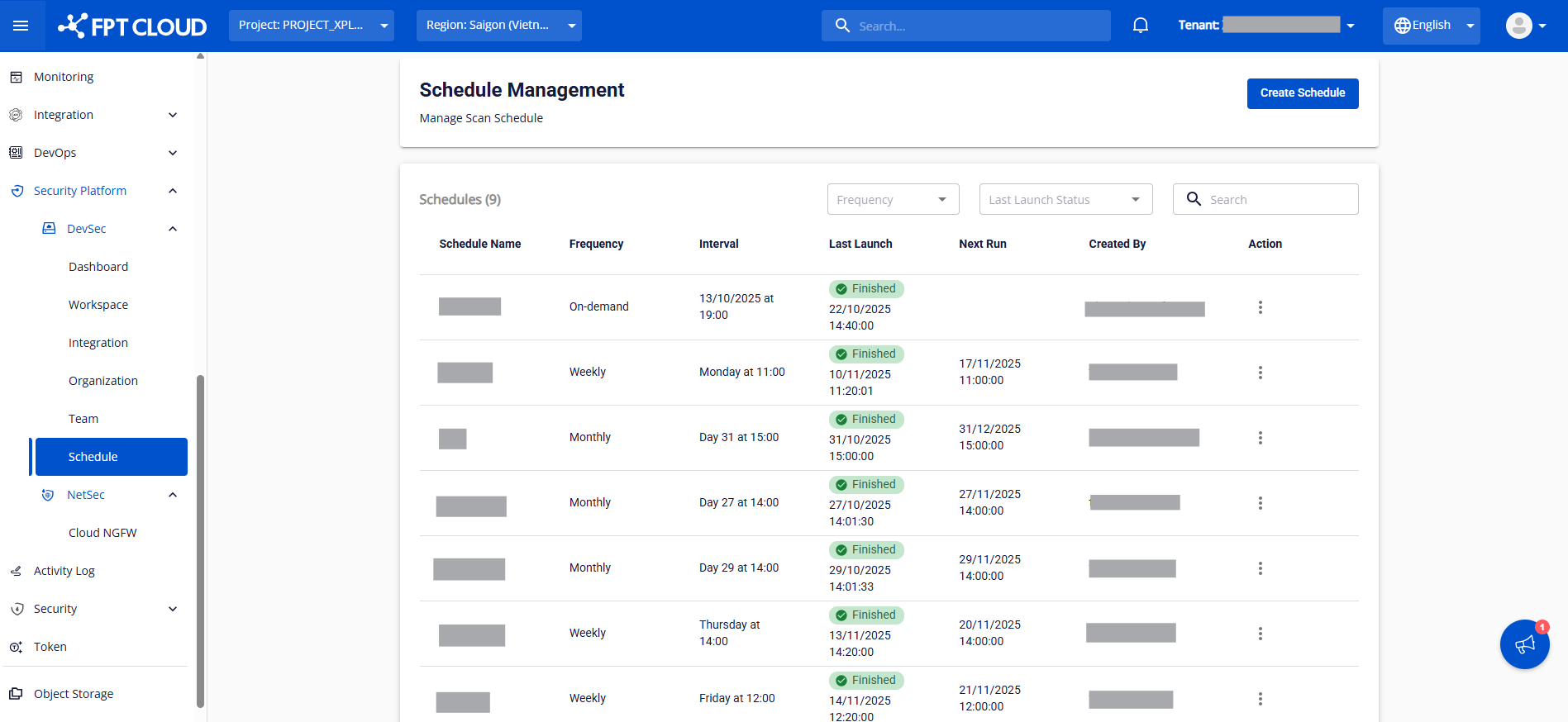 Bước 1: Tại thanh menu bên trái, chọn Security Platform → DevSec → Schedule. Màn hình Schedule Management hiển thị danh sách các Schedule được sắp xếp mặc định theo ngày tạo từ mới nhất đến cũ nhất: Alt text Bước 2 : Quan sát các thông tin hiển thị: