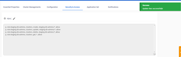 ArgoCD hỗ trợ phân quyền cho người dùng sử dụng rbac policy config. Mặc định user mới tạo sẽ có quyền readyonly khi đăng nhập hệ thống. FPT Cloud hỗ trợ người dùng cấu hình RBAC policy thông qua giao diện như sau: Bước 1 : Vào màn hình Security & Access > RBAC Bước 2 : Nhập cấu hình RBAC mong muốn: Ví dụ: p, role:staging-db-admins, clusters, create, staging-db-admins/, allow p, role:staging-db-admins, clusters, update, staging-db-admins/ , allow p, role:staging-db-admins, clusters, delete, staging-db-admins/, allow p, role:staging-db-admins, clusters, get, , allow* Bước 3 : Kết quả sau khi lưu: Để thực hiện xoá các policy đã cấu hình thực hiện update và xoá dòng policy muốn xoá. Thực hiện tương tự việc update.