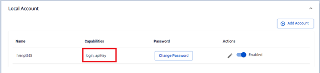 Bước 1 : Tại màn hình Security & Access > Local Account , thực hiện Edit Account : Bước 2 : Thực hiện tích chọn bổ sung hoặc bỏ tích chọn đối với lựa chọn đã có. Lưu ý: Cần chọn ít nhất 1 lựa chọn capabilities (apiKey/login) cho user Bước 3 : Click Edit để hoàn thành việc edit Kết quả sau khi edit: