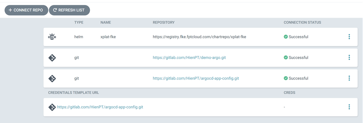 Bước 1: Cấu hình repository helm chart Cấu hình helm repository, trường hợp helm chart public có thể không cần cấu hình helm repo, tuy nhiên nếu helm chart private cần cấu hình helm repo để ArgoCD có thể get repository deploy ứng dụng. Ví dụ add helm repository của xplat tới ArgoCD Kết quả cấu hình thành công repository: Bước 2: Tạo Applications để deploy chart cert-manager Kết quả sau khi deploy applications: Kiểm tra kết quả deploy dưới k8s cluster: Lưu ý : Trong trường hợp deploy applications sử dụng helm chart deploy, argocd sẽ lấy file chart về để deploy như manifest. Do đó dưới cụm k8s cluster khi get list helm chart sẽ không thấy chart deploy.*