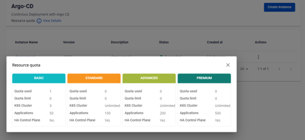 FPT Cloud cung cấp các gói dịch vụ Argo CD cho người dùng tại phần Quota Detail.