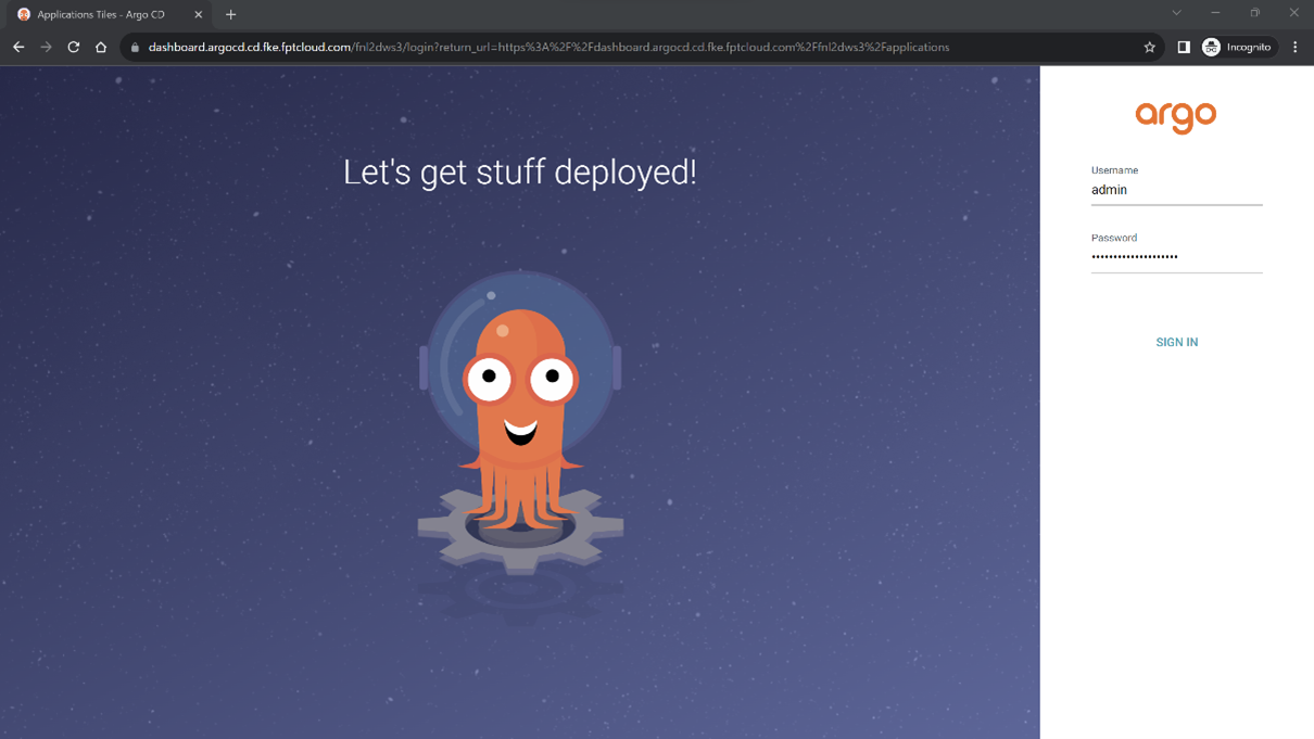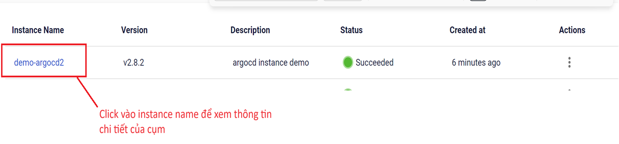 Để làm việc với cụm ArgoCD đã được khởi tạo, đầu tiên bạn vào xem thông tin chi tiết của cụm đã được khởi tạo. Bước 1 : Xem thông tin chi tiết của cụm, Click vào Instance Name để xem thông tin chi tiết. Tại màn hình đâu tiên, bạn sẽ được cung cấp thông tin chi tiết để truy cập ArgoCD cluster bao gồm url, username/password đăng nhập: Bước 2 : Đăng nhập vào ArgoCD cluster : Tại màn hình Essential Properties à Thực hiện copy url và truy cập vào ứng dụng: