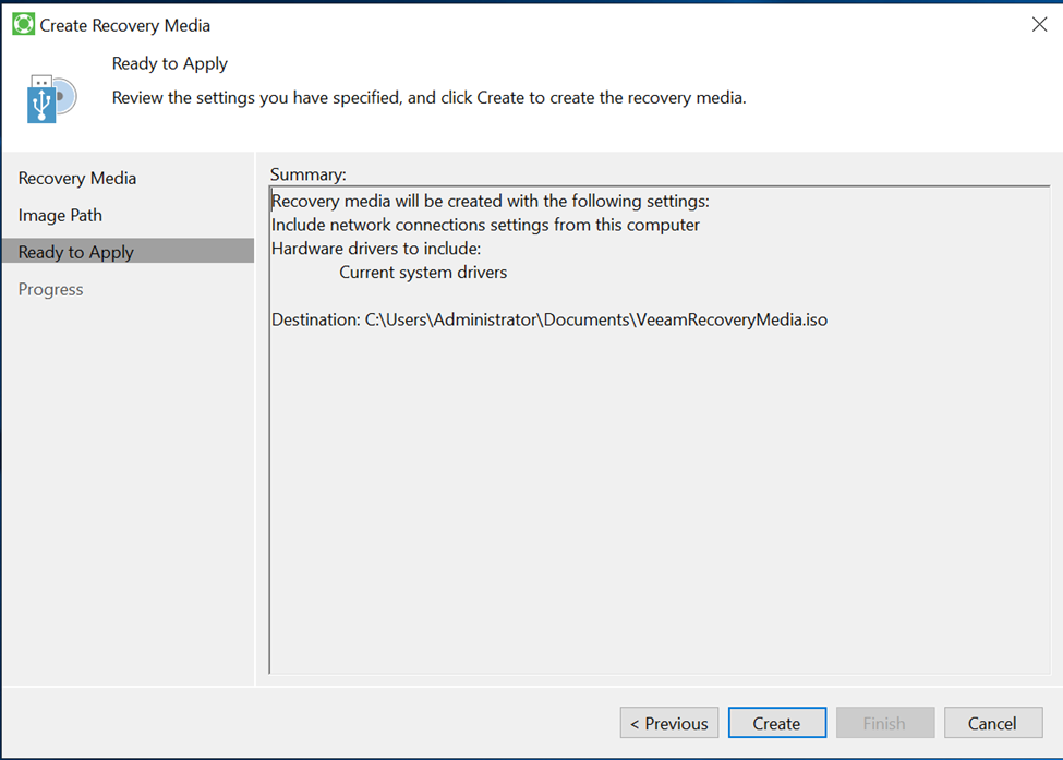 Bước 1: Khởi động ứng dụng Create Recovery Media. file Bước 2: Cửa sổ hiện ra, tùy chọn các kết nối mạng, driver mà bạn muốn tích hợp vào file Veeam Recovery Media sau đó bấm Next để tiếp tục. file Bước 3: Đặt tên và chọn nơi lưu trữ file ISO. Sau đó bấm Next để tiếp tục.