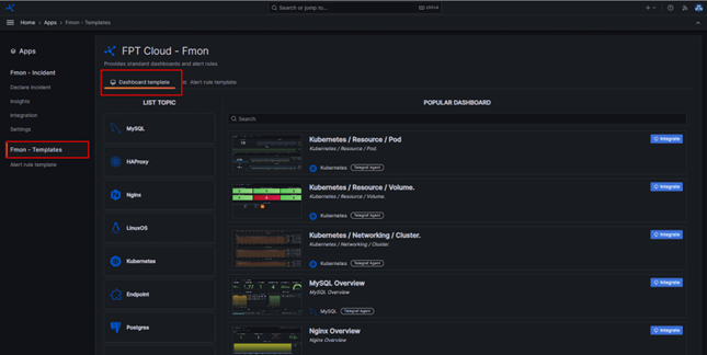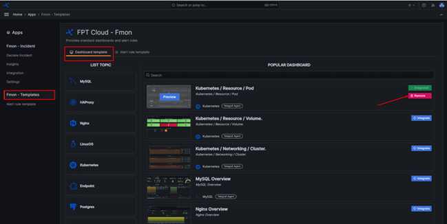 Giúp bạn triển khai nhanh chóng thông qua các mẫu dashboard mà FPT Cloud Monitoring cung cấp, sẵn sàng ngay để sử dụng. 7.2.1. Cài đặt dashboard template Bước 1 : Đăng nhập vào dashboard (xem mục 7.1. Truy cập vào dashboard) Bước 2 : Trên menu trái, click Apps > FMON Template Alt text Bước 3 : Click Dashboard Template Bước 4 : Chọn một dashboard, click Integrate Alt text 7.2.2. Gỡ bỏ Dashboard Template Bước 1 : Đăng nhập vào dashboard (xem mục 7.1. Truy cập vào dashboard) Bước 2 : Trên menu trái, click Apps > FMON Template Alt text Bước 3 : Click Dashboard Template Bước 4 : Chọn một dashboard đã cài đặt, click Remove Alt text