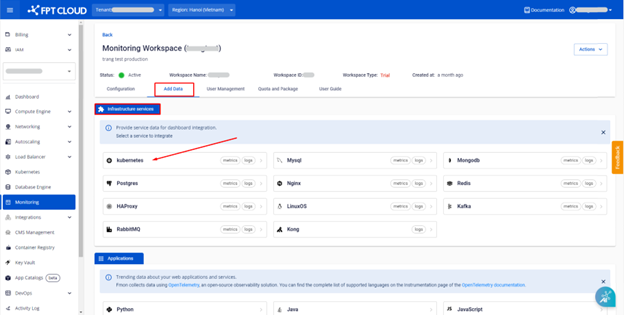 Bước 2 : Trên menu của FPT Cloud Portal, click Monitoring.