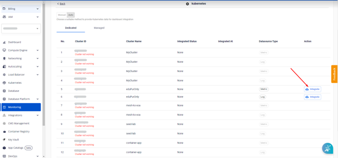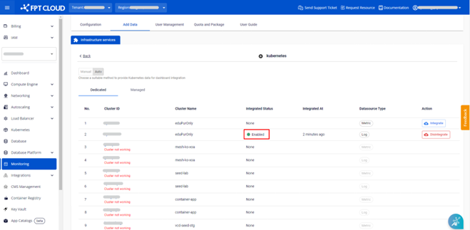 Ngoài ra, FPT Monitoring hỗ trợ tích hợp tự động Kubernetes Dedicated và Kubernetes Managed.