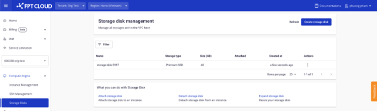 • Nếu các thông tin hợp lệ thì hệ thống tạo storage và đi đến trang Storage disk