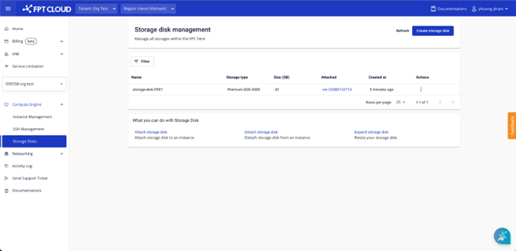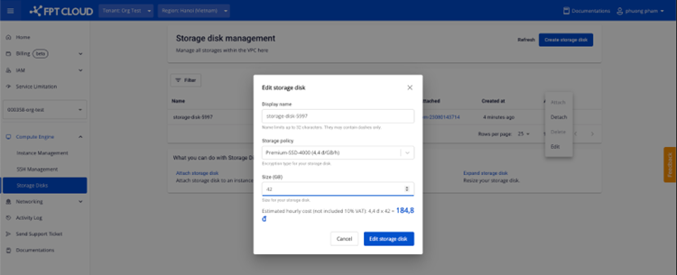 - Hệ thống sẽ trừ tiền chi phí sử dụng storage trong 1h ngay khi thay đổi.