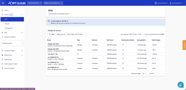 • Có thể xem danh sách dịch vụ đã sử dụng gồm: Máy ảo, IP, Storage file